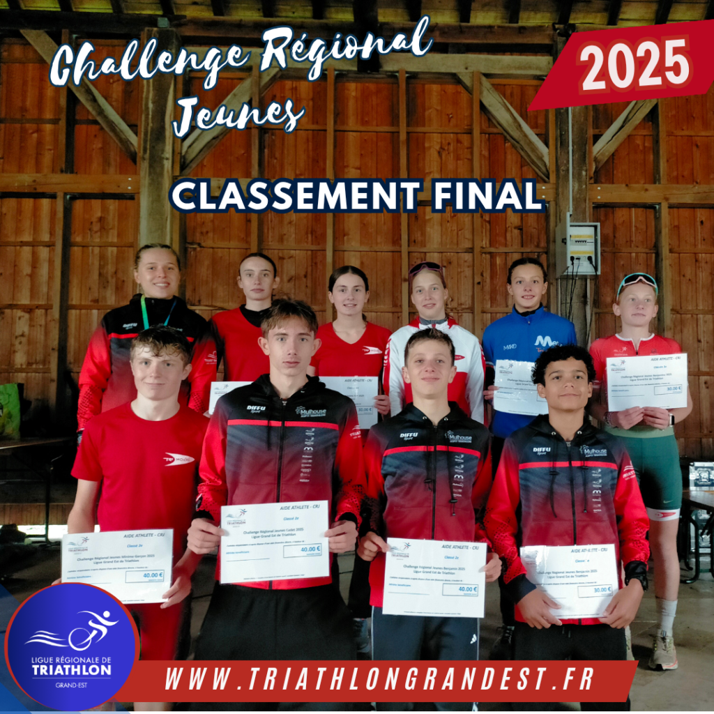 Cette édition du CRJ a une nouvelle fois mis en lumière l’engagement, la performance et le dynamisme de nos jeunes athlètes et de leurs clubs, dans les catégories Benjamins à Juniors. Pour rappel, le CRJ est structuré en deux volets (Individuel et Clubs) et vise à récompenser l’investissement sportif tout au long de la saison. Les performances ont été évaluées sur cinq manches régionales et interrégionales (Duathlon, 1/2 Finale CF Triathlon, Aquathlon, Class Tri et Vainqueur Grand Est Triathlon), avec une sixième manche collective lors des Vainqueurs Grand Est de Raid. Cette édition 2025 est marquée par l’arrivée du STADE DE REIMS TRIATHLON à la 1ère place (2e en 2024), dépassant donc le TRIMOVAL MOLSHEIM, 1er en 2024 qui bascule à la 2e position cette année. Dans le Top 4, on retrouve l’ASPTT MULHOUSE TRI (3e) et METZ TRIATHLON (4e) qui confirment leur constance au plus haut niveau régional. L’édition 2025 du Challenge Régional Jeunes comporte un grand renouvellement des premières places individuelles, preuve de la profondeur des talents dans la région. En effet, aucun n°1 de 2024 n’aura conservé sa position 2025, que ce soit dans la même catégorie ou dans la catégorie supérieure suite à la montée d’âge. Les Podiums Individuels 2025 Le Challenge Individuel reconnaît la régularité et le niveau de performance de nos licencié(e)s. Après une saison riche en compétitions, nous félicitons chaleureusement les athlètes qui se sont hissés sur le podium de leur catégorie. Catégorie Rang Nom & Prénom Club Benjamines Filles (BEF) 1ère MICHEL Luce METZ TRIATHLON 2ème SIMON Nora VITTEL TRIATHLON 3ème OURY Zelie TRIMOVAL MOLSHEIM Benjamins Garçons (BEG) 1er CORME Arthur STADE DE REIMS TRIATHLON 2ème BEURTHERET Flavio ASPTT MULHOUSE TRI 3ème CAPUT MARTEL Leo ASPTT MULHOUSE TRI Minimes Filles (MIF) 1ère MAILLOT Anaelle STADE DE REIMS TRIATHLON 2ème RINCKEL Pauline TRIMOVAL MOLSHEIM 3ème OURY Lucile TRIMOVAL MOLSHEIM Minimes Garçons (MIG) 1er STEINER Tim VITTEL TRIATHLON 2ème KAUFFMANN Mathis TRIMOVAL MOLSHEIM 3ème RAULINE Marco STADE DE REIMS TRIATHLON Cadettes Filles (CAF) 1ère DESCLOZEAUX Amandine TRIMOVAL MOLSHEIM 2ème SAVRY Victoria STADE DE REIMS TRIATHLON 3ème MARTIN Emma STADE DE REIMS TRIATHLON Cadets Garçons (CAG) 1er LEMOINE Imanol STADE DE REIMS TRIATHLON 2ème SPIEGEL Jules ASPTT MULHOUSE TRI 3ème SAVIO Paul METZ TRIATHLON Juniores Filles (JUF) 1ère POULAT Erin-Rose STADE DE REIMS TRIATHLON 2ème BRULE Marie METZ TRIATHLON 3ème OESTERLÉ Chloé ASPTT MULHOUSE TRI Juniors Garçons (JUG) 1er FRESSIER Ben STADE DE REIMS TRIATHLON 2ème PFEIFFER Louis ASPTT STRASBOURG TRI 3ème POULAT Valere STADE DE REIMS TRIATHLON Les Podiums Clubs par Niveau de Labellisation Le Challenge Régional Jeunes des Clubs (CRJC) valorise l’esprit d’équipe et la représentativité sur l’ensemble des compétitions. L’édition 2025 consacre donc le club du STADE DE REIMS TRIATHLON, vainqueur du classement général et qui a démontré une mobilisation et un niveau de performance remarquable. Le classement des clubs est par niveau de labellisation de la FFTRI « Ecole de Triathlon ». Écoles de Triathlon *** (3 Étoiles) Rang Club 1er STADE DE REIMS TRIATHLON 2e TRIMOVAL MOLSHEIM 3e ASPTT MULHOUSE TRI Écoles de Triathlon ** (2 Étoiles) Rang Club 1er VITTEL TRIATHLON 2e ASPTT STRASBOURG TRI 3e TRIATHLON NANCY LORRAINE Écoles de Triathlon * (1 Étoile & non labellisés) Rang Club 1er TRI VOSGES DU NORD 2e SG WANTZENAU TRI 3e EPERNAY TRIATHLON PAYS DE CHAMPAGNE La Ligue adresse ses plus sincères félicitations à l’ensemble des jeunes athlètes pour leur engagement et leur esprit sportif, ainsi qu’à tous les clubs et bénévoles qui ont permis à cette saison 2025 d’être une grande réussite. Retrouvez le classement complet du CRJ 2025 : ICI.