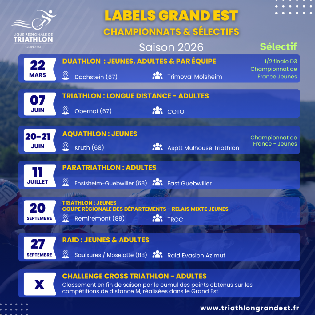 • Le championnat Grand Est de Cross Triathlon se déroulera pour la première fois en 2026 sur le même fonctionnement du Challenge National. Tous les athlètes ayant participé à 2 Cross Triathlon M dans la région Grand Est seront classés.