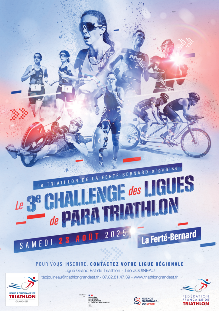 Le Challenge des Ligues de Para Triathlon se tiendra à La Ferté-Bernard le samedi 23 août 2025. Ce rendez-vous national est une belle opportunité de représenter fièrement notre région dans une ambiance sportive, conviviale et inclusive ! Comment cela se passe ? L’épreuve se déroule sous forme de relais mixte de 4 athlètes. Chaque équipe doit être composée d’au moins 1 homme et d’1 femme et doit inclure un athlète en fauteuil roulant pratiquant le handbike et le fauteuil de course. Les autres athlètes (R2, R3, R4) sont des athlètes debout pratiquant le triathlon de manière classique ou en tandem. Les distances à parcourir : 300 mètres de natation 6,6 kilomètres de cyclisme 1,2 kilomètre de course à pied Bonne nouvelle : le déplacement sera entièrement pris en charge par la Ligue Grand Est de Triathlon, afin de permettre à chacun de participer avec le moins de contrainte financière. Quelque soit votre niveau, l’essentiel est de participer, de partager un moment fort en équipe et de représenter les couleurs de la Ligue Grand Est ! Infos & inscriptions : Retrouvez le programme complet de l’édition 2025 : cliquez ICI Pour vous inscrire, contactez Tao Jouineau à la Ligue : taojouineau@triathlongrandest.fr / Tél : 07.82.81.47.39 Nous comptons sur votre énergie et votre enthousiasme pour porter haut les couleurs de notre région !